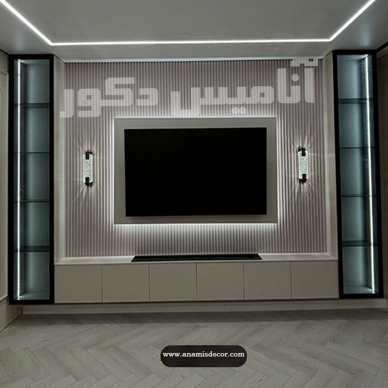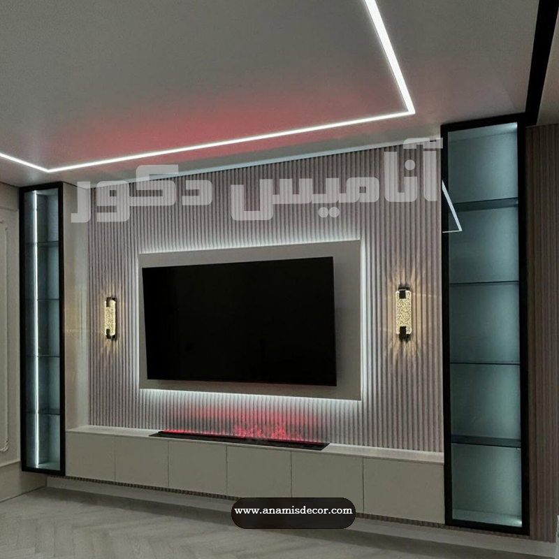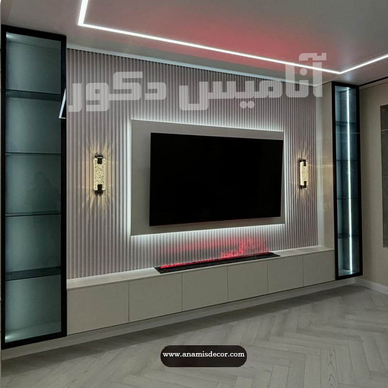 ترمووالmdf + باکس معلق از جنسmdf +کمد دکوری با شیشه فریم لس + میز tv مدرن با شومینه برقی +چراغ دیواری مدرن +نورپردازی + امور سیم کشی